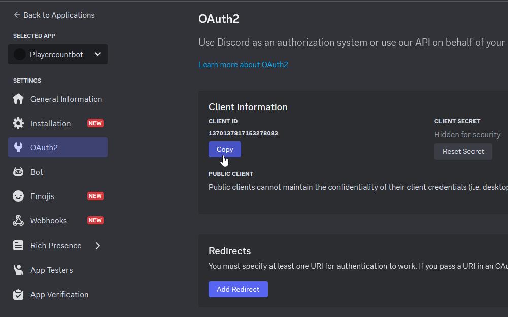 - Go back to PlayerCountBot and paste the CLIENT ID into the Bot Client ID field