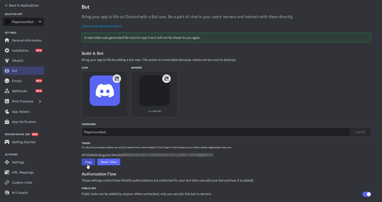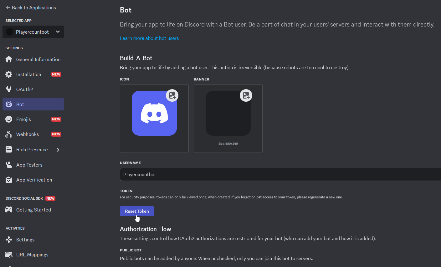 | TIP: Want a profile picture for your bot? Go back to the Bot tab in the Developer Portal and upload a custom icon and banner.